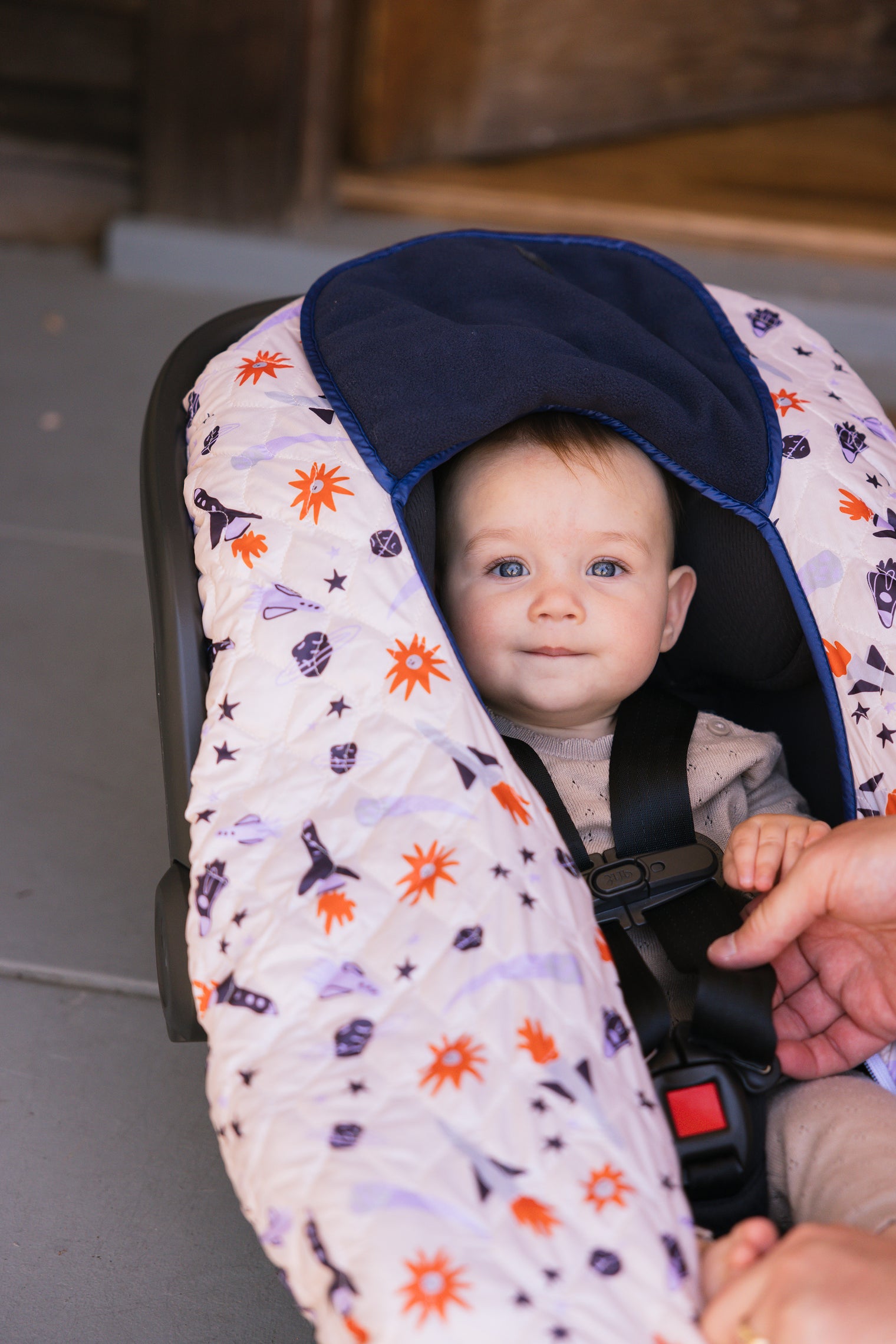 Bring on the breeze. Our deluxe Carrier Cover is perfect for cool-weather travel or strolls, featuring soft fabric and cozy fleece lining to keep your baby warm. With elasticized edging and a front-zip function, the cover fits most infant car seats.